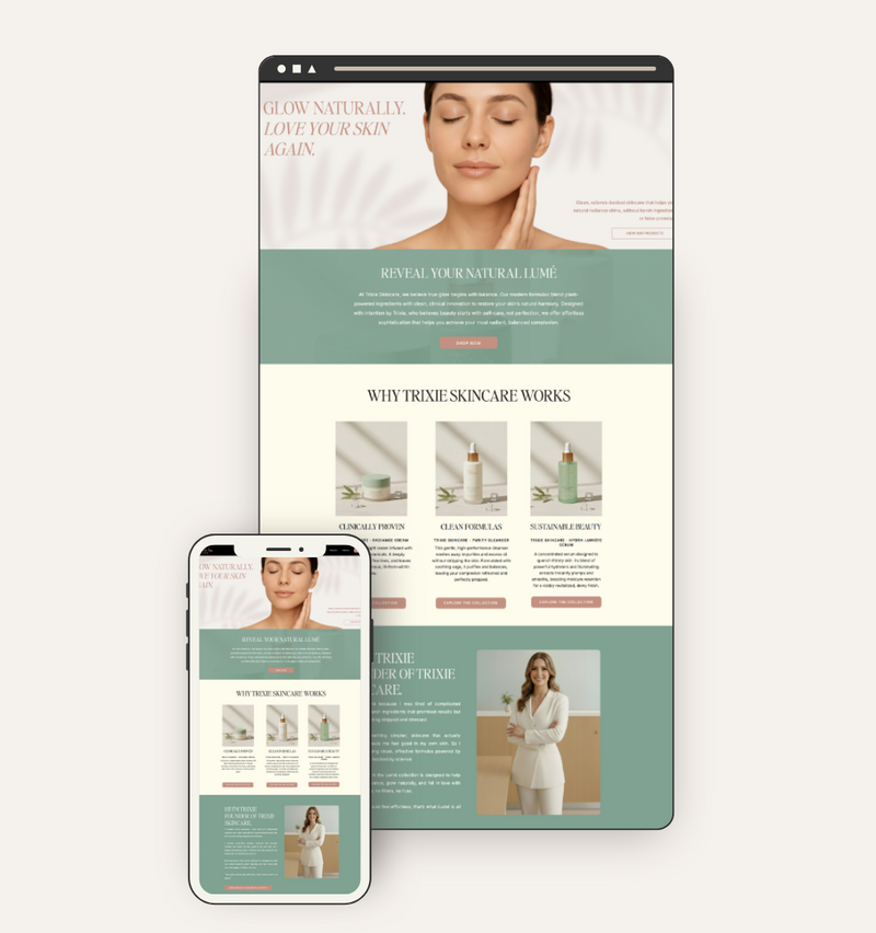 Perfect for new beauty, lifestyle, or wellness brands ready to make a confident online debut. This one-page website offers a refined, strategic layout that highlights your story, services, and contact details, all in one seamless scroll. Designed to feel elevated yet effortless, it’s the ideal choice for quick launches or minimal online presences that still leave a lasting impression.